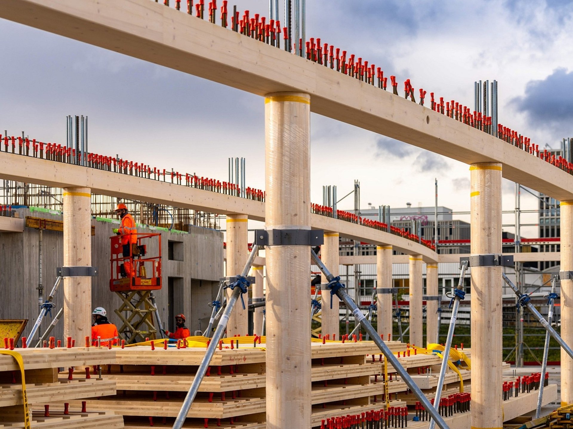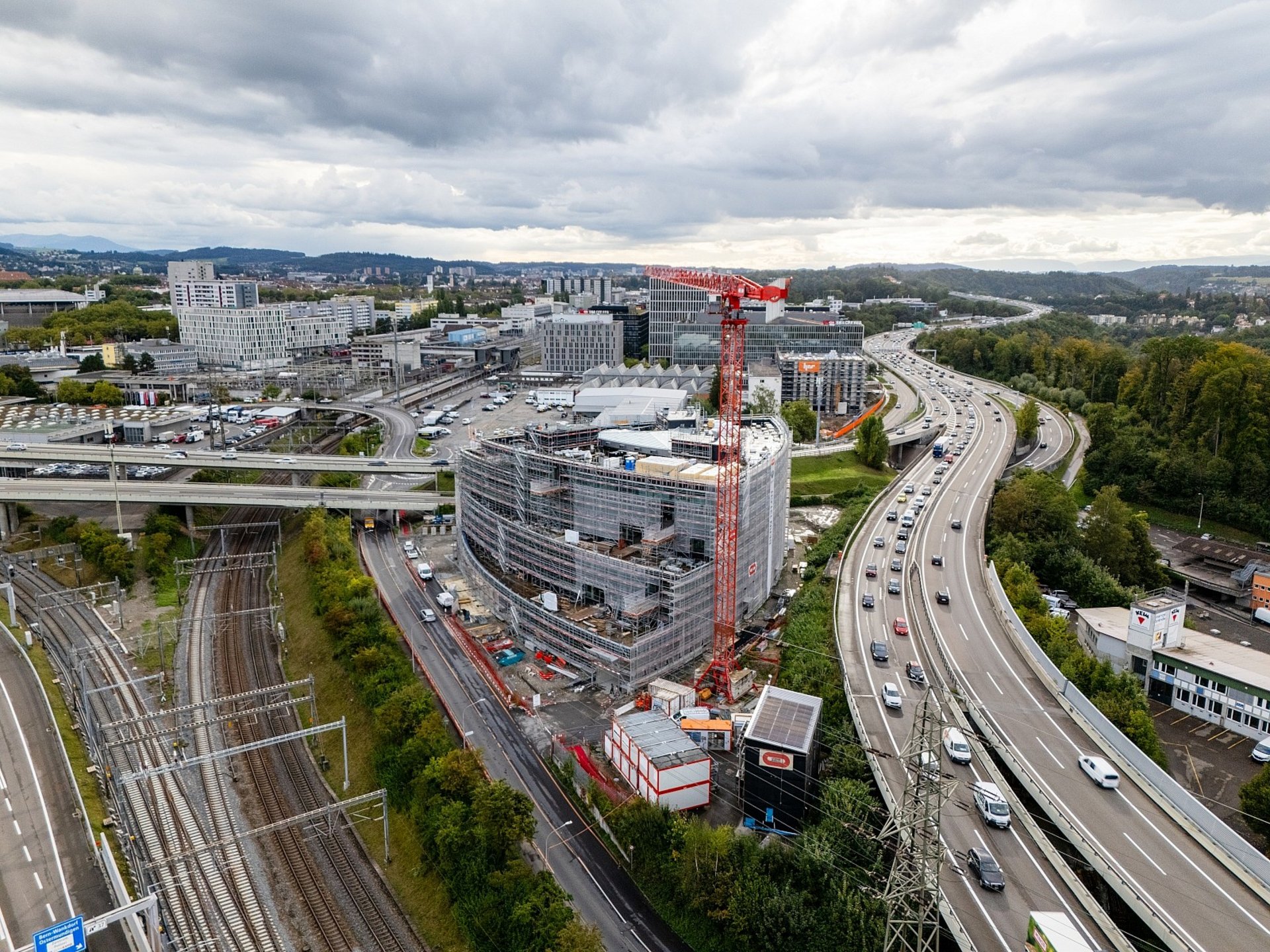 Im Zentrum des Verkehrsknotenpunkts Wankdorf entstand der Neubau Bern 131 als sichtbares Leuchtturm-Projekt. Das moderne Dienstleistungsgebäude weist sieben Vollgeschosse auf. Das bis zu 5m hohe, abgestufte Unter- und 4m hohe Erdgeschoss sind in Massivbau ausgeführt und im gut tragfähigen Baugrund flach fundiert. Die fünf Obergeschosse bildet ein Skelettbau als Holz-Hybridbau mit Holzbeton-Verbunddecken und runden Holzstützen. Die vorfabrizierten Holzelemente sind aus einheimischem Holz aus dem Kanton Bern hergestellt.