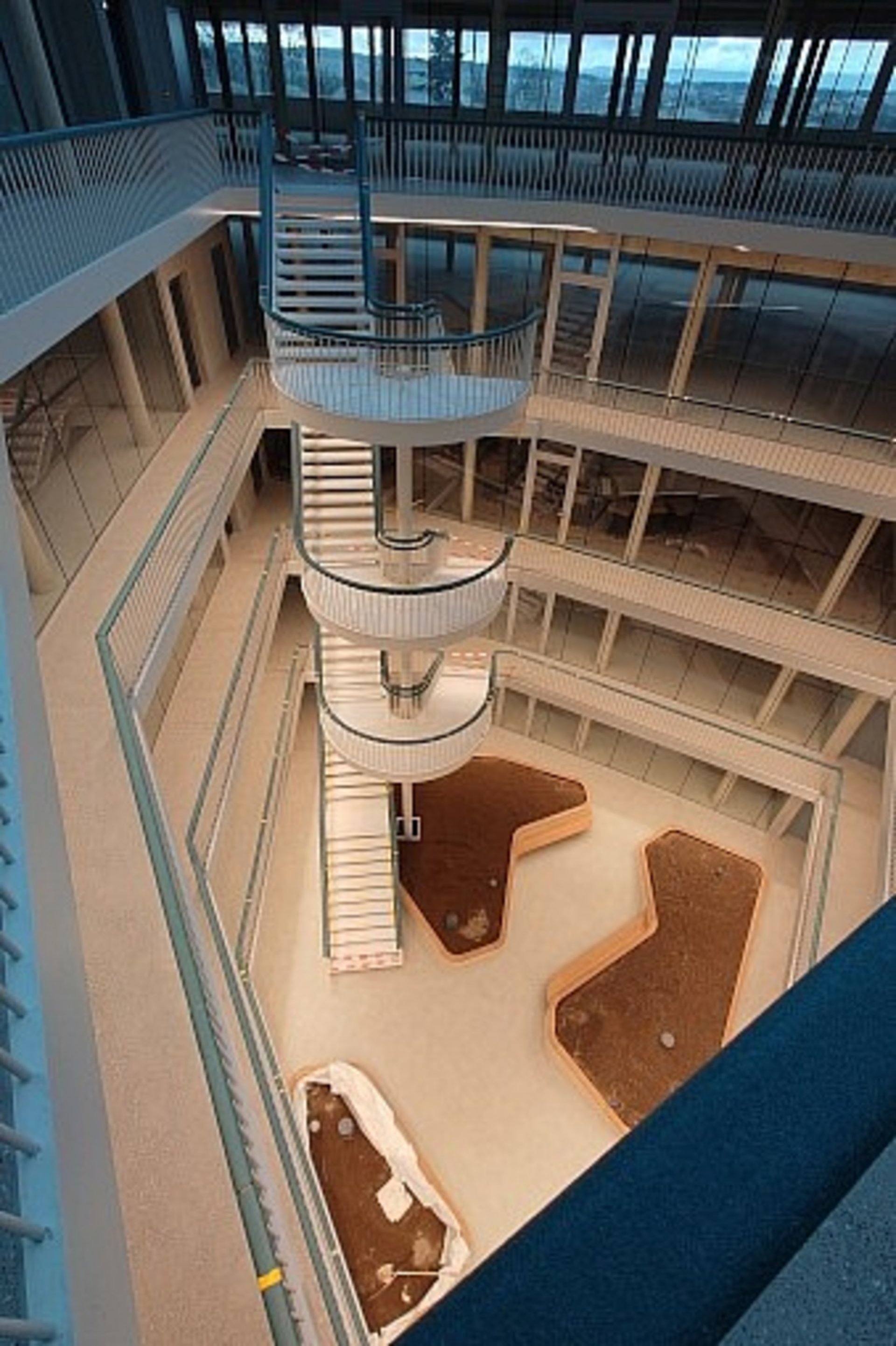 Die Aussteifung gegen Wind- und Erdbeben erfolgt durch drei Erschliessungskerne in Stahlbeton und der grosszügige Innenhof ist durch ein filigranes Attriumdach in Stahl-Glasbau mit 15m Spannweite gedeckt.