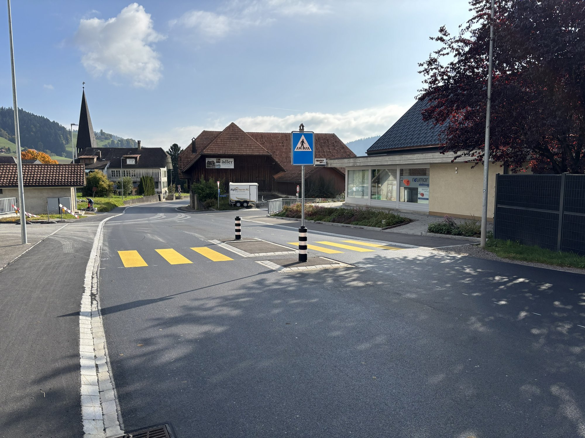 Zur Erhöhung der Fussgängersicherheit wurde eine neue, klar markierte Fussgängerquerung erstellt. Der Zäzibach wurde aufgeweitet und der Durchlass erneuert, um den Hochwasserschutz zu verbessern. Sämtliche Werkleitungen wurden ersetzt und neu strukturiert verlegt. Die Massnahmen werten den Ortskern funktional und gestalterisch deutlich auf.