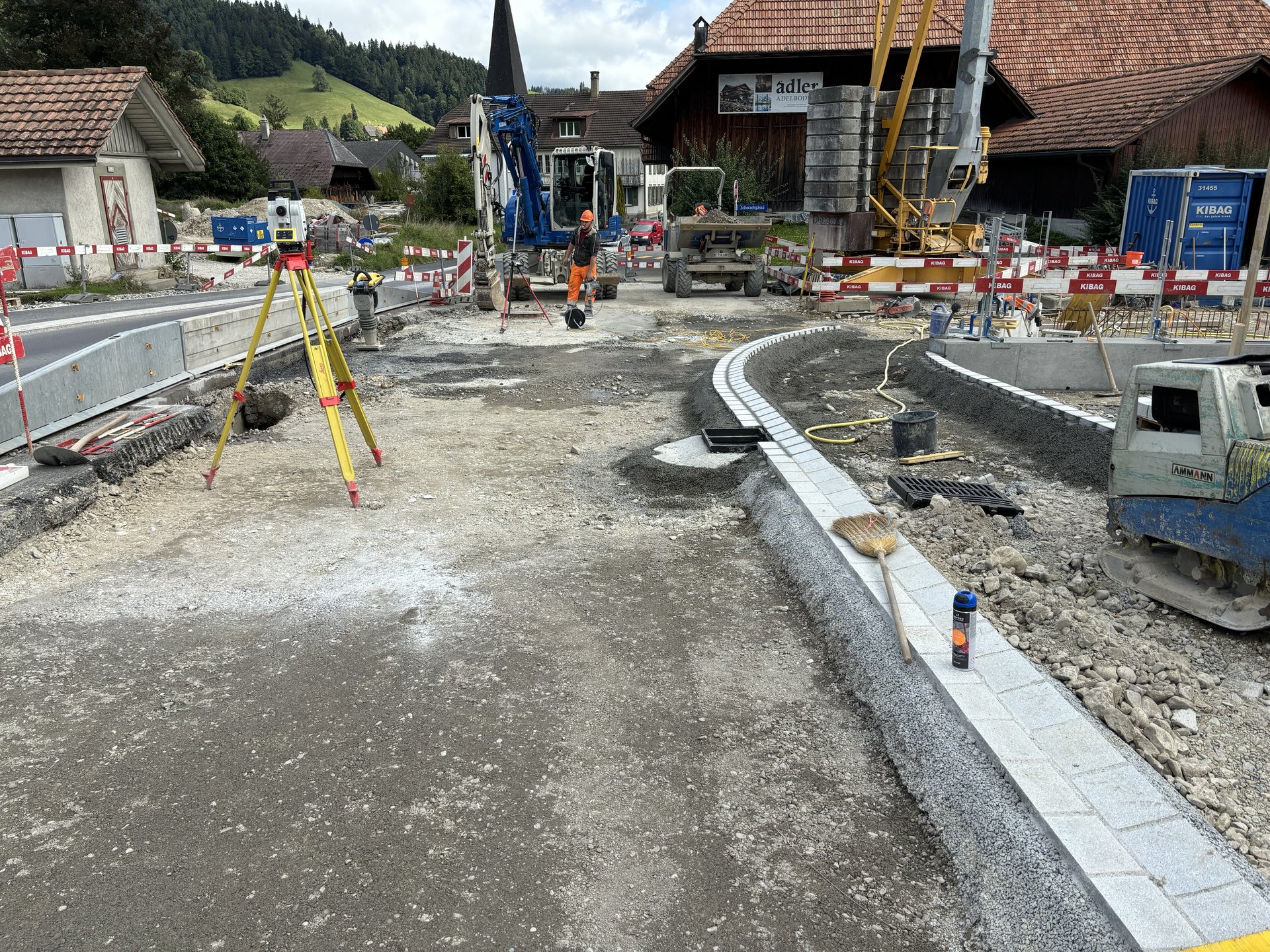 Im Rahmen der Sanierung der Bernstrasse im Ortskern von Zäziwil wurden umfassende bauliche und verkehrstechnische Verbesserungen umgesetzt. Die Fahrbahn erhielt einen neuen lärmmindernden Belag, um die Lärmemissionen nachhaltig zu reduzieren. Gleichzeitig wurde die Strasse hinsichtlich Sichtweiten, Querprofilen und Breite optimiert, was die Verkehrsführung verbessert und die Verkehrssicherheit erhöht.