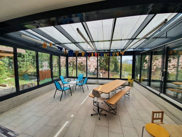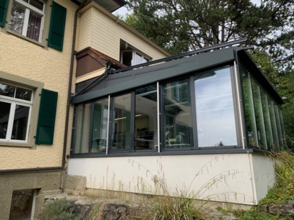 Das Gebäude «Aarhus» am Rainweg 11 in Muri bei Bern wurde umgebaut zur Nutzungseinlagerung der Tagesschule der Schulanlage Horbern. Das Baujahr der ursprünglichen Bausubstanz ist etwa 1910. Dokumentiert waren bereits umfangreiche bauliche Veränderungen aus dem Jahr 1985/86, wo bei allen Geschossen ein grosser Anteil der Innenwände abgebrochen und an neuer Lage neu erstellt wurden. Weiter wurden ein Lift und eine neue Treppenanlage eingebaut. 2007 erfolgte im Erdgeschoss eine Erweiterung der Küche, Büro, sowie Wohnraum durch einen Wintergarten, mit Abbruch ursprünglicher Aussenwände. Das «Aarhus» ist nicht im kantonalen Bauinventar gelistet. Das Gebäude wurde bis Ende 2021 durch die Stiftung Aarhus genutzt und war seit dann bereits in Zwischennutzung durch die Tagesschule. Die räumlichen Anforderungen und Nutzerwünsche von Seite Leitung Tagesschule wurden nun umgesetzt ohne Erweiterung oder Aufstockung des Bestandes. Mittels Sondagen konnte das Tragwerk mit genügend Klarheit aufgeschlossen werden, sodass die Eingriffe in das Tragwerk sehr gering gehalten werden konnten.