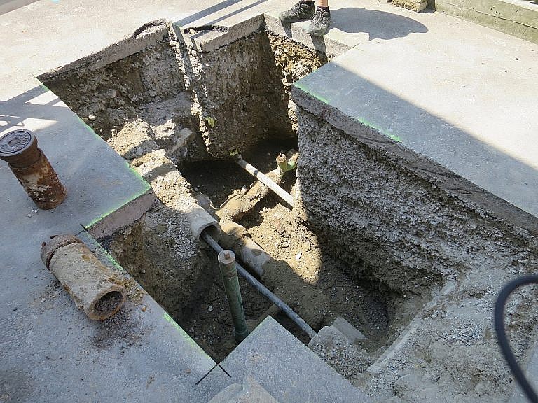 Die Hauptleitung wird im gespriessten Graben verlegt. Die Hausanschlussleitungen werden teils in die alten Gussleitungen eingezogen und nur mit punktuellen Gruben zusammengeschlossen.